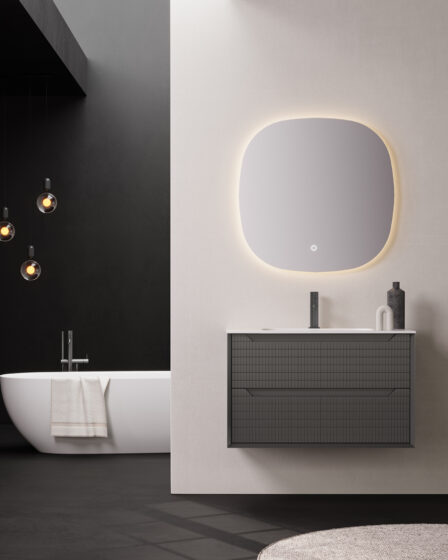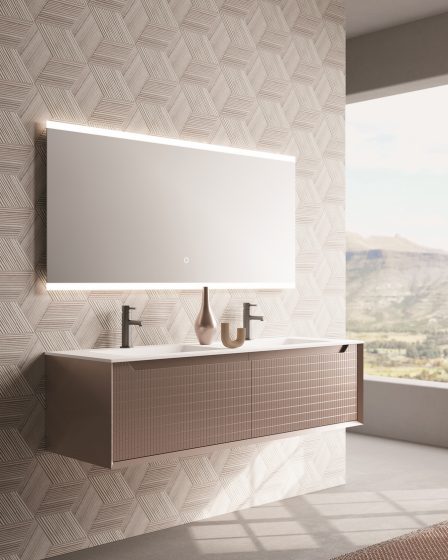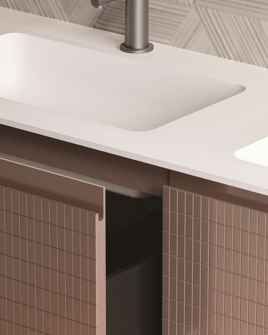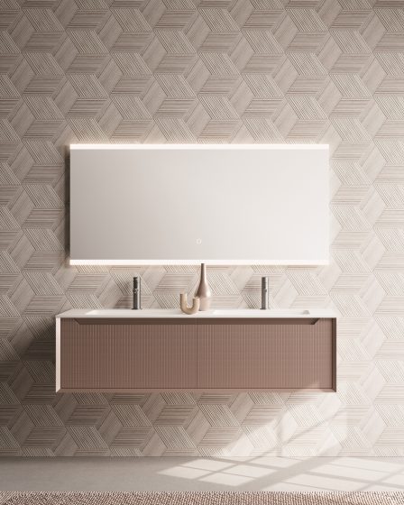 Izuzetan dizajn panela s rešetkastim utorima nalik mozaiku s vertikalnim i horizontalnim linijama. Metalik roza boja s metalnim sustavom ladica u istoj boji s metalnim izrezima istog tona. Mat čvrsta ploča s integriranim umivaonikom. Ogledalo bez okvira sa svjetlom od 4000K.